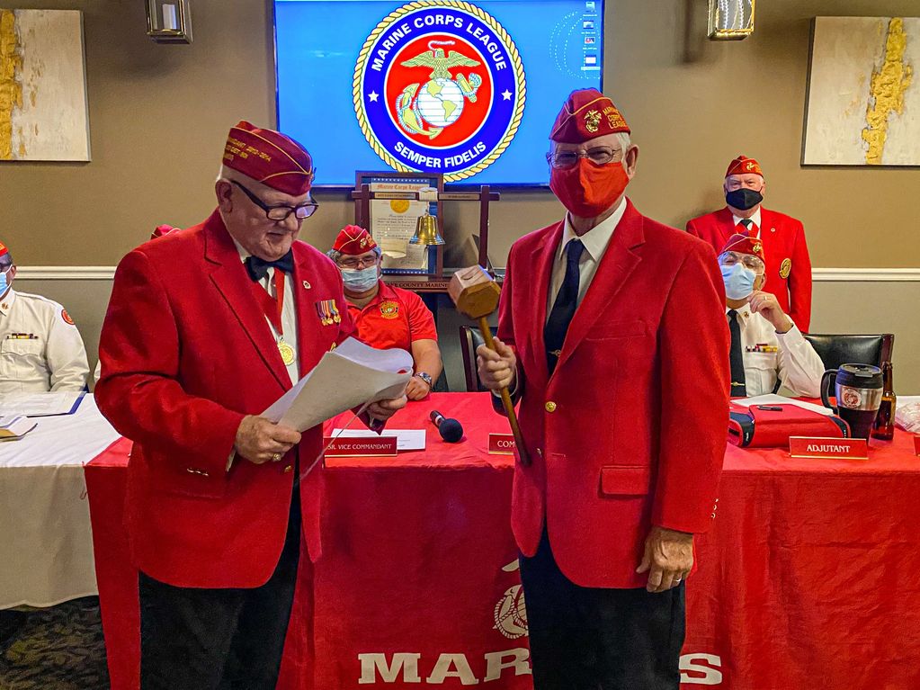 Ed Mampe receives the gavel of office as Lake County Detachment 801 Commandant from installing officer Al Seyler.
